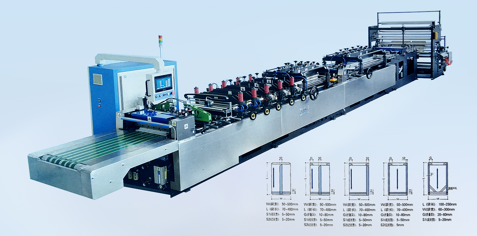 材料:各種復合薄膜。 卷筒:寬度≤1200mm,直徑≤800mm。 制袋速度:180段/分(機械設計速度)約<40m/min。 制袋寬度:≤500mm。 制袋長度:50-400mm,制袋長度超過400mm 以上應采用倍送功能。